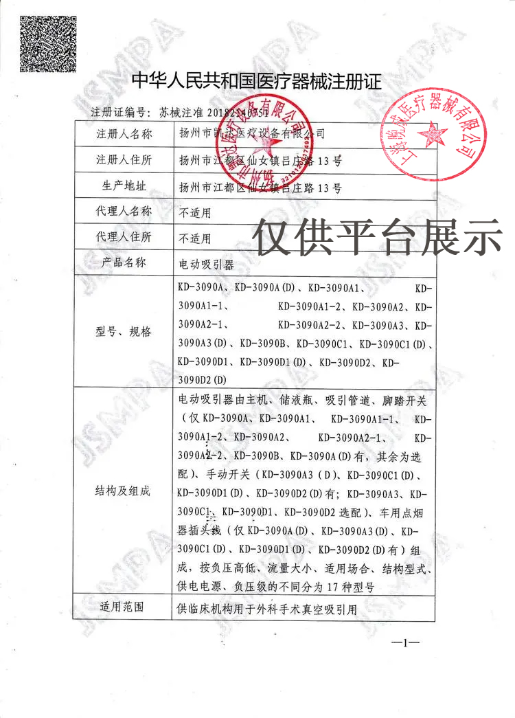 該吸引器用于醫(yī)院手術(shù)室等場(chǎng)合,吸取病人體腔內(nèi)的膿、血、痰等粘質(zhì)液體,亦可用于人工流產(chǎn)。
