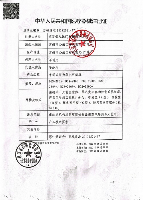 產(chǎn)品名稱 : | 登冠手提式壓力蒸汽滅菌器DGS-280B |